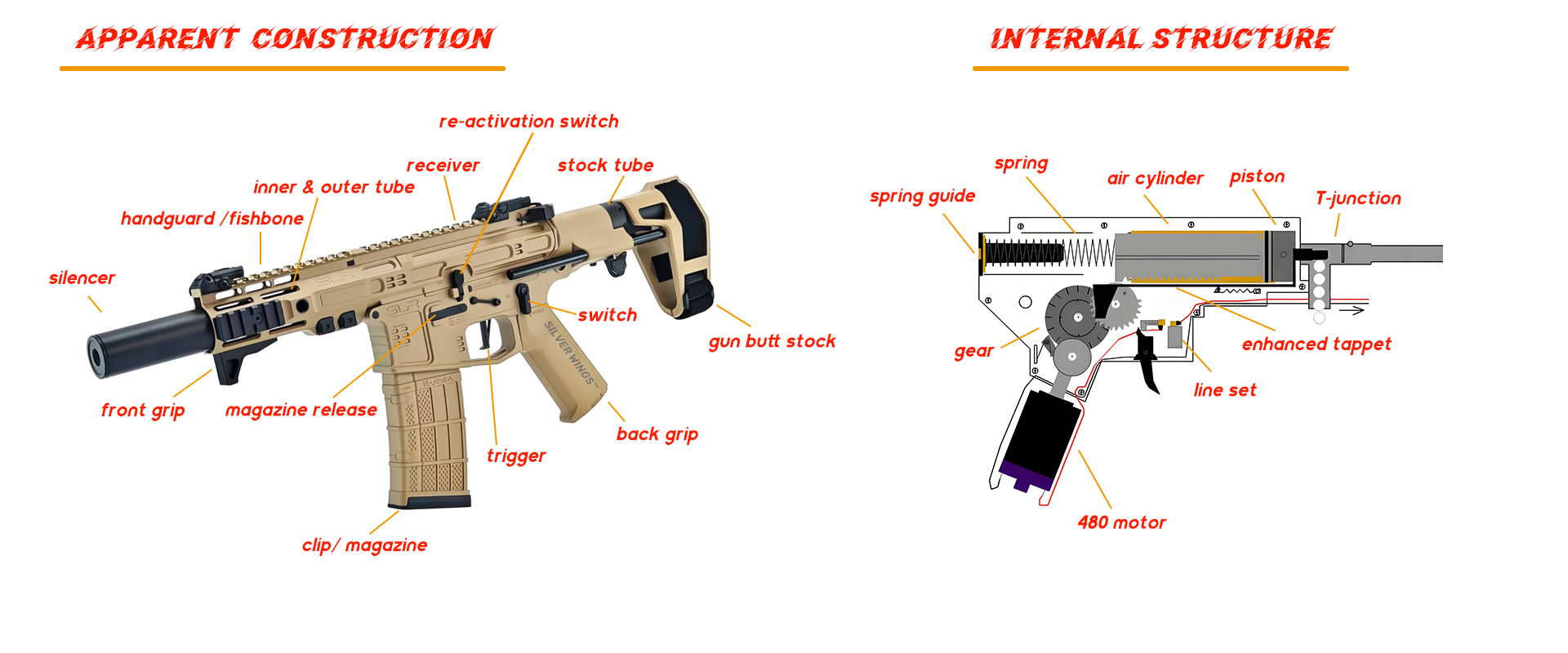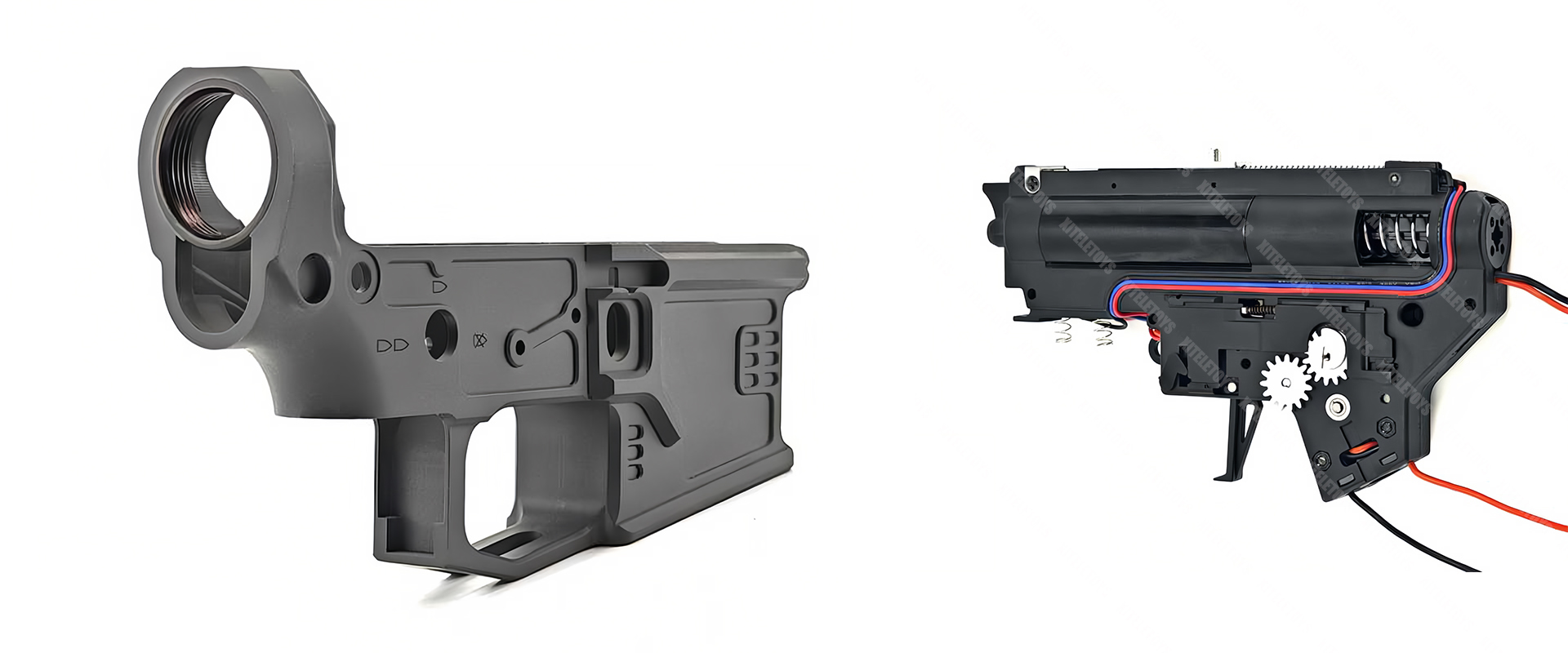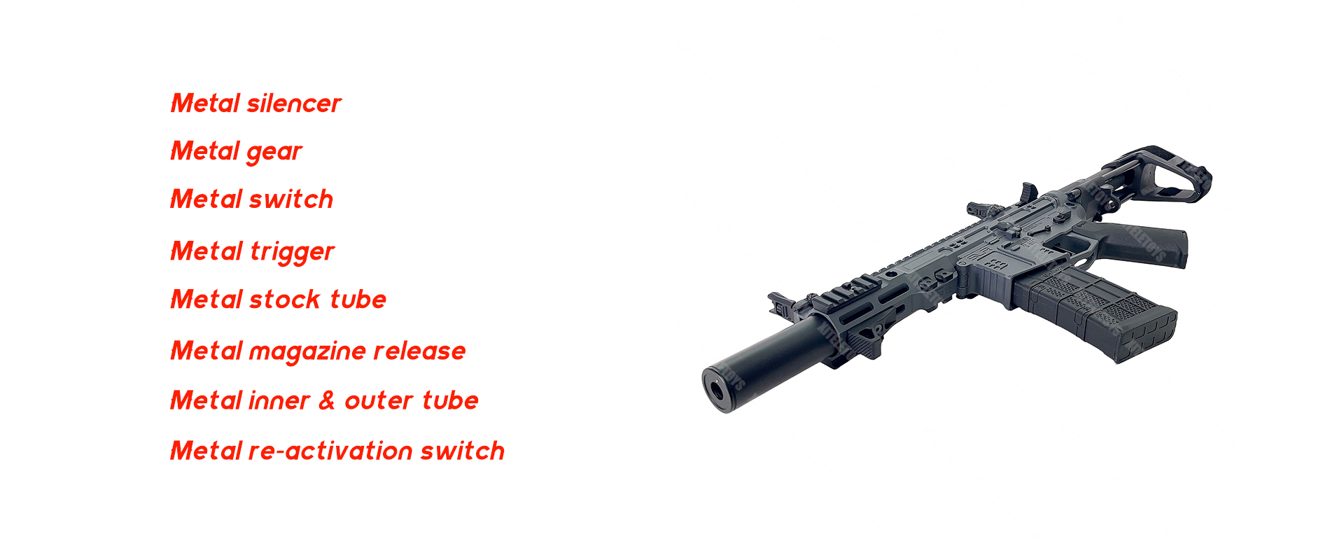 - Exterior Metal Accessories: Components such as the charging handle, magazine catch, ejection - port tennis racket, right - side bolt - catch release, two - side fire - selector, magazine catch, decorative PIN lock, and stock - core threaded ring are installed on the receiver, increasing the realism and convenience of operation. The front - section has a QD base, fore - grip lock, decorative silencer, sleeve, inner barrel, and rail, further expanding the functions and appearance of the firearm.
